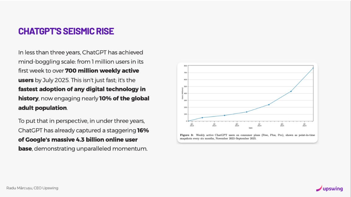 Figura 1: Adoptia record a tehnologiei AI: ChatGPT a atins 700 de milioane de utilizatori activi saptamanal in iulie 2025, capturand 16% din baza de utilizatori Google in mai putin de trei ani. (Sursa: Upswing Power Session)