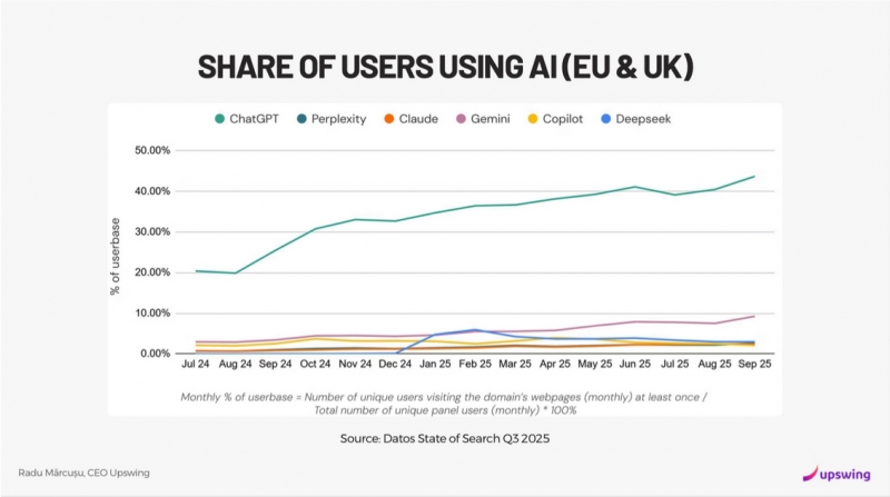 Figura 2: Peisajul AI in Europa si UK: ChatGPT isi consolideaza pozitia de lider dominant, dublandu-si cota de utilizare intr-un singur an, in timp ce competitorii precum Gemini sau Copilot cresc intr-un ritm mai lent. Date analizate de Upswing pe baza raportului Datos State of Search Q3 2025.